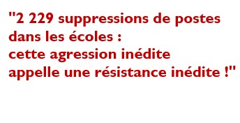 Sans attendre les instances de carte scolaire, le SNUDI-FO appelle ainsi ses syndicats départementaux à réunir partout et sous toutes les formes possibles les personnels et les parents d’élèves pour préparer la résistance, pour préparer les blocages et les occupations d’école, les grèves, les rassemblements pour mettre en échec ce plan de destruction de l’Ecole publique.