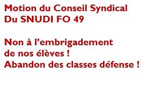 Motion Conseil Syndical SNUDI FO 49 : Non à l’embrigadement de nos élèves, abandon des classes défense !