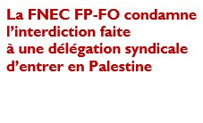 La FNEC se joint à l’Internationale de l’Éducation pour protester contre l’interdiction faite à une délégation de syndicats de l’enseignement de se rendre en Cisjordanie occupée. Cette délégation comprenait notamment le secrétaire général de l’Internationale de l’Éducation, ainsi que des dirigeants de syndicats enseignants du monde entier. Elle avait pour unique but de rencontrer nos collègues palestiniens et de leur apporter la solidarité de tous les affiliés de l’IE.